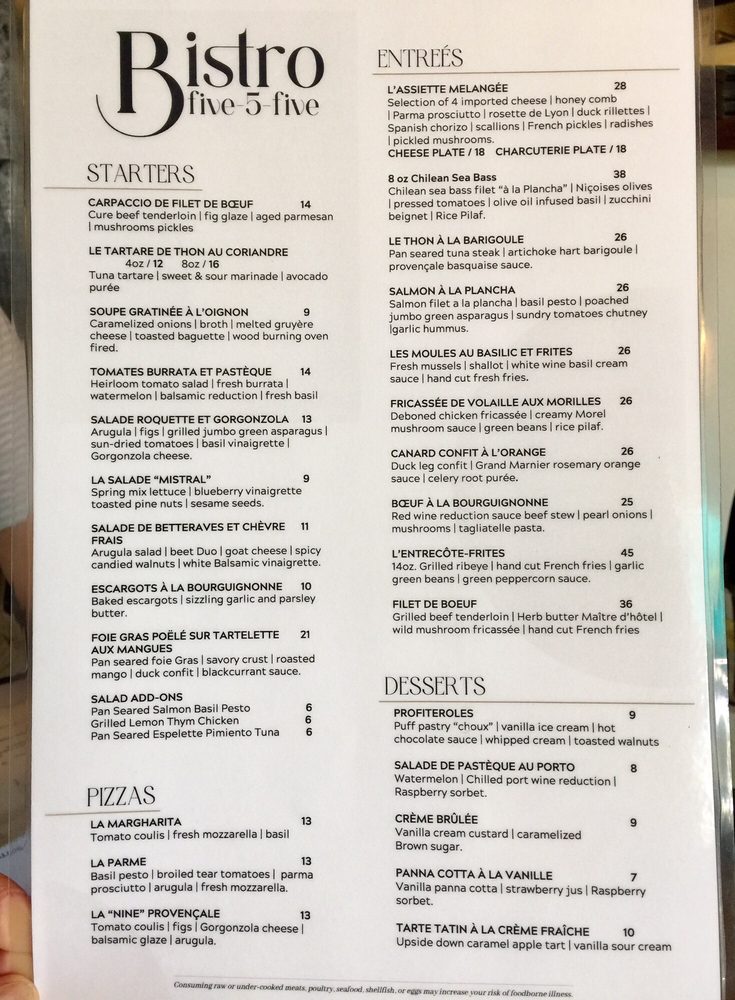 Bistro 555 offers a charming European ambiance with a diverse menu of French comfort classics, pizzas, and appetizers like escargots and charcuterie. Customer reviews rave about the intimate atmosphere, excellent service, and high-quality food. The Bœuf à la Bourguignonne and L'Entrecôte-Frites are standout dishes, noted for their tender meat and flavorful sauces. The restaurant's limited seating and popularity highlight its hidden gem status, with reservations recommended. Prices are reasonable for the quality and experience offered, making it a great spot for a special occasion or casual night out. The cozy setting, attentive staff, and delicious cuisine make dining at Bistro 555 a memorable and enjoyable experience.